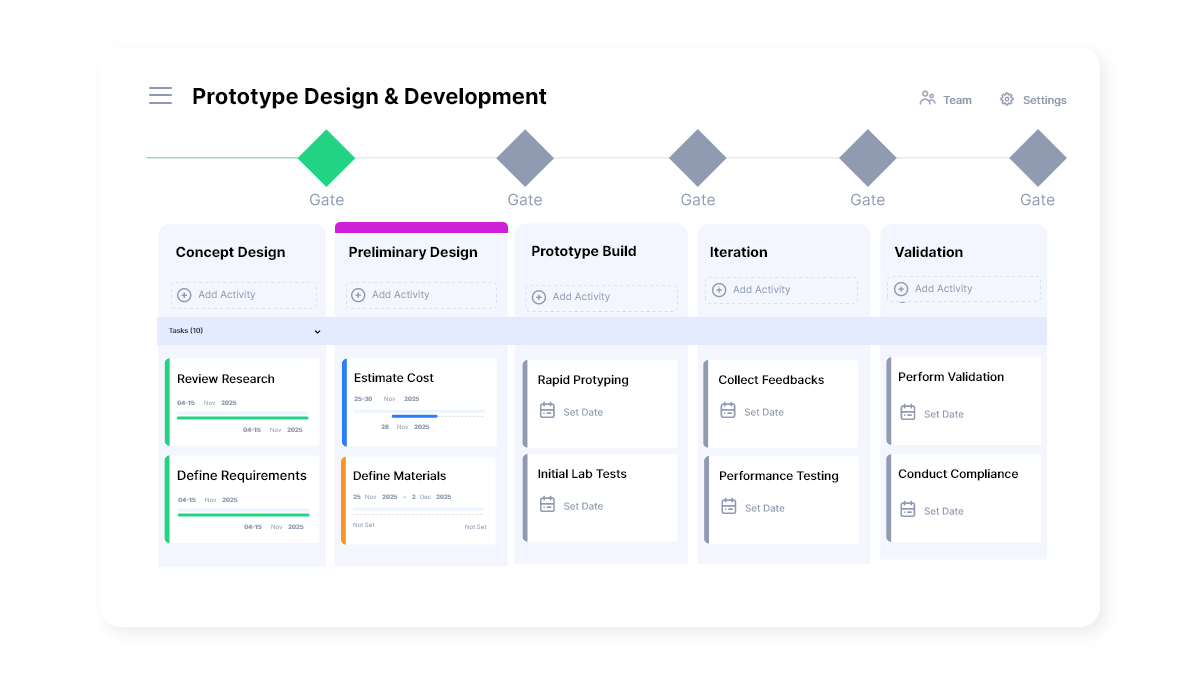 This structure gives R&D leaders the ability to plan predictable cycles while adapting to new insights as they emerge. Risks are addressed at the right moments, rather than at the finish line. The gate reviews encourage teams to pause, reflect, and make decisions with full visibility.