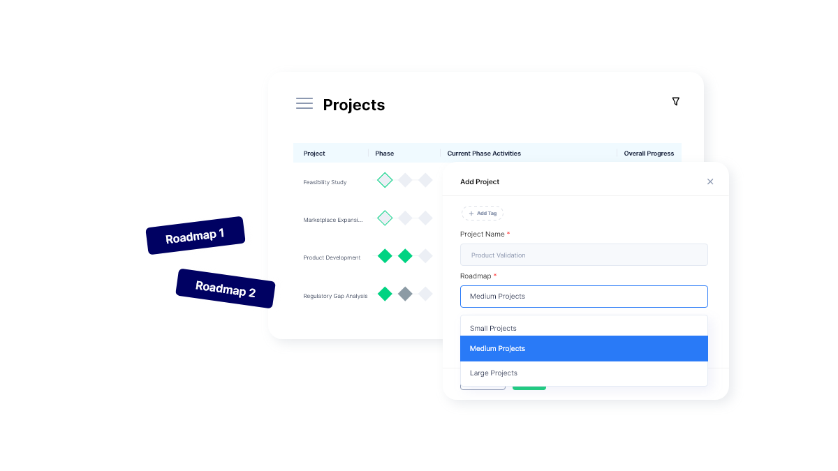 Planally’s phase-gated workflow engine gives teams full visibility into every stage of the R&D lifecycle. Each project is structured into defined phases, with clear entry and exit criteria. This makes it easier to monitor timelines, flag risks early, and ensure compliance with internal standards or regulatory requirements.