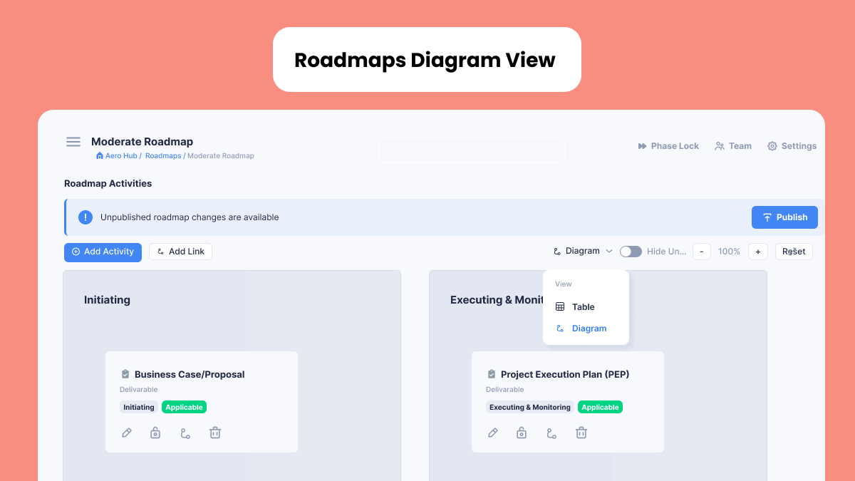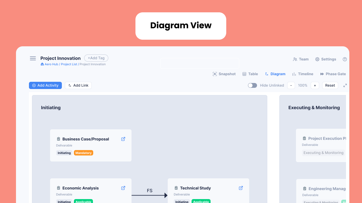 Diagram View turns your workflow into an interactive visual map. It shows phases, activities, and relationships so teams can understand the sequence of work instantly.