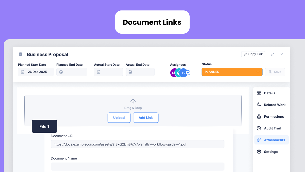Instead of uploading files, you can now add a direct link to any document or resource. This keeps workflows light and ensures everyone accesses the latest version.