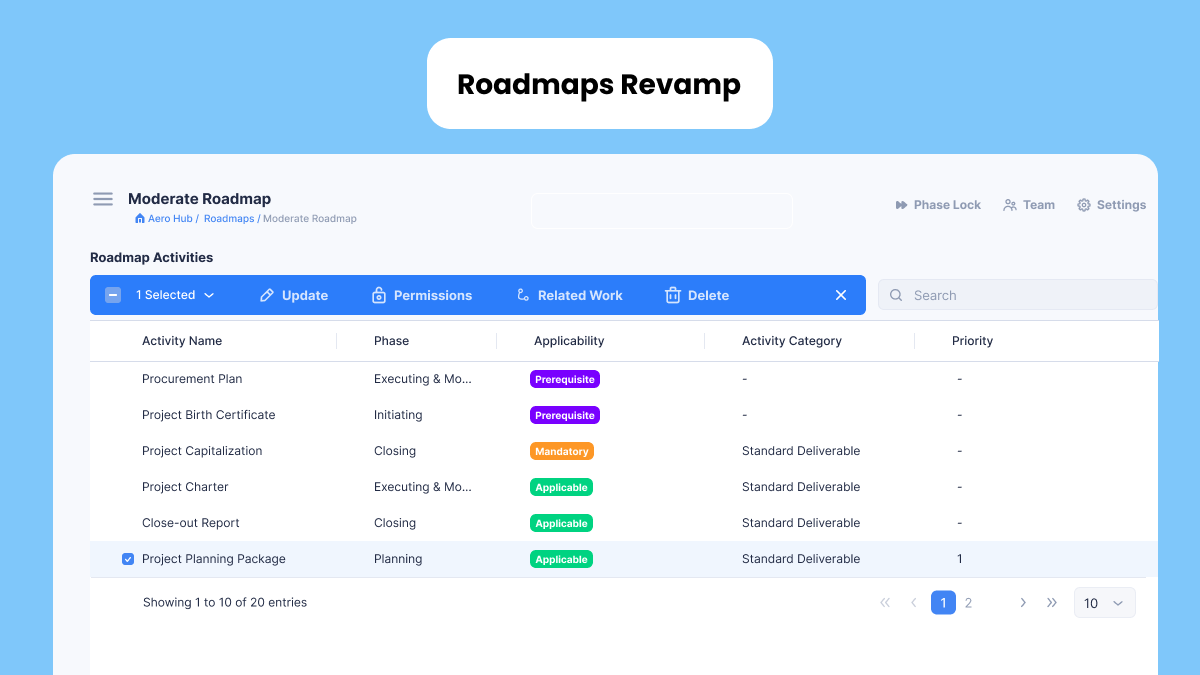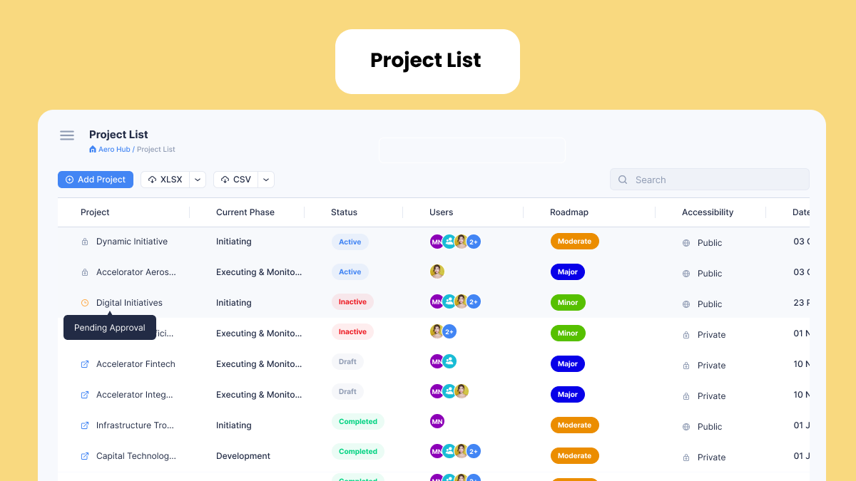 - Search, filter, and sort projects by phase, status, or roadmap.